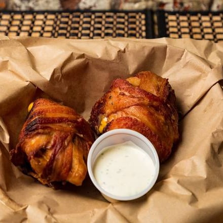 Only at best burger barn! fresh grilled chicken breast stuffed with jalapeños and cheese, wrapped in thick sliced bacon and deep fried.