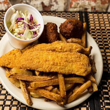 Fresh, cornmeal coated by hand and deep fried served with hush puppies, Cole slaw, and house fries
