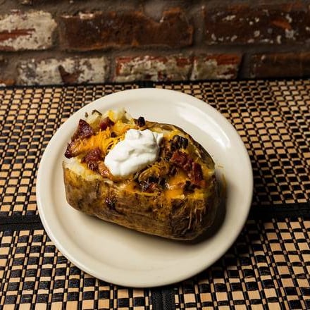 Giant Idaho baked potato with cheese, sour cream, butter, and bacon and 1/3 lb of your choice of our own house smoked brisket. pulled pork or chicken.