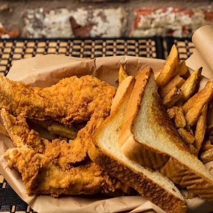 Three big hand cut fresh chicken breast strips, battered and deep fried served with house fries, gravy and Texas Toast
